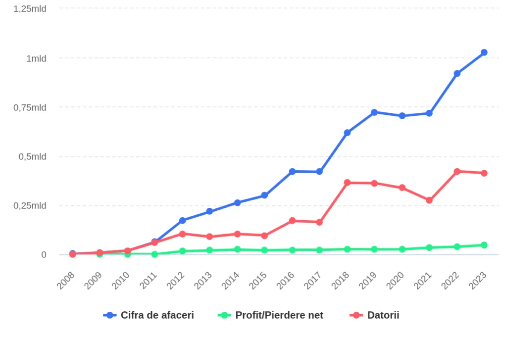 Analiză cu datele platformei Termene.ro. Grupul Catena-Fildas, probabil cel mai important din domeniul farmaceutic, a depășit în ultimii ani o cifră de afaceri totală de peste 2 miliarde de euro, așa cum au anunțat reprezentanții companiei. Cu toate acestea, doar una dintre societățile din grup a trecut până în 2023 de pragul cifrei de afaceri de un miliard de lei. Este vorba de firma Fildas Trading. Acest lucru s-a schimbat anul trecut, atunci când și Catena Hygeia SRL a depășit acest prag.