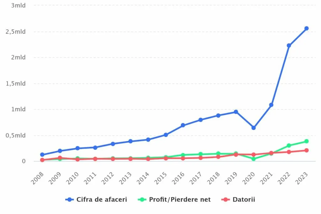 Inditex România SRL din București a raportat pentru 2023 o cifră de afaceri de peste 2,55 miliarde de lei. Este cu 14% mai mare față de anul precedent. Asta după ce, în 2022, cifra de afaceri a fost de 2,22 miliarde de lei. S-a înregistrat astfel o creștere de aproape 330 de milioane de lei de la an la an, între 2023 și 2022. Cifra de afaceri din 2023 a fost totodată și cea mai mare din istoria companiei.
