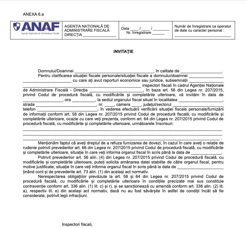 O prevedere legală adoptată în urmă cu șase luni va figura și pe formularul de „Invitație” trimis de Agenția Națională pentru Administrare Fiscală (ANAF) contribuabililor.