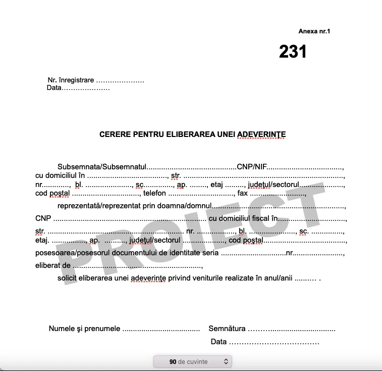 Formular 231 Cerere adeverință de venit