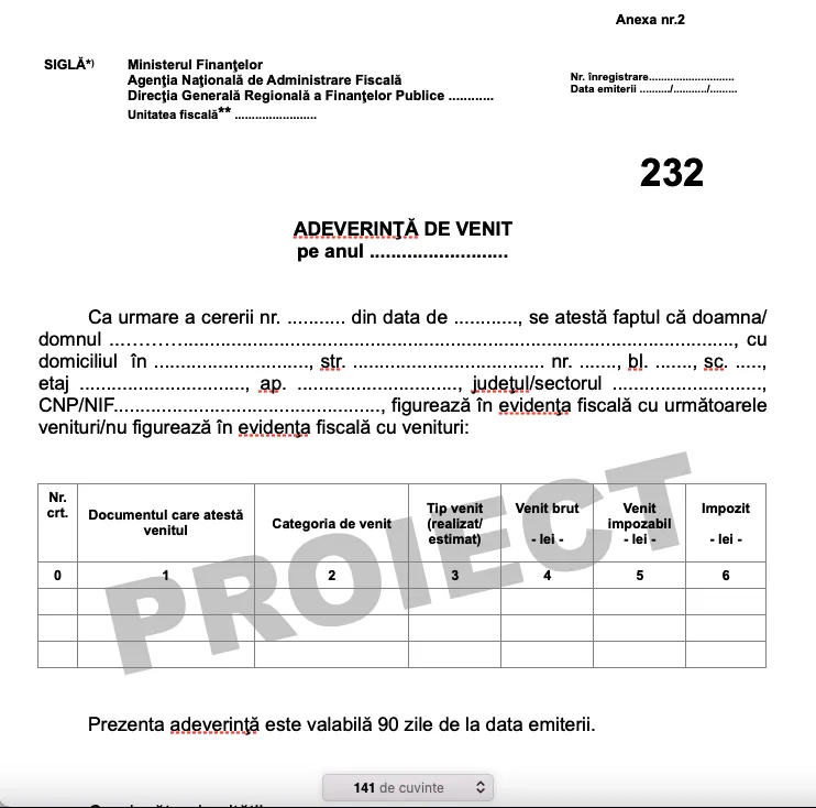 Mai exact, ordinul propus de ANAF se referă la procedura și conținutul formularelor care duc la eliberarea adeverinței de venit de către o agenție fiscală la cererea unui contribuabil.