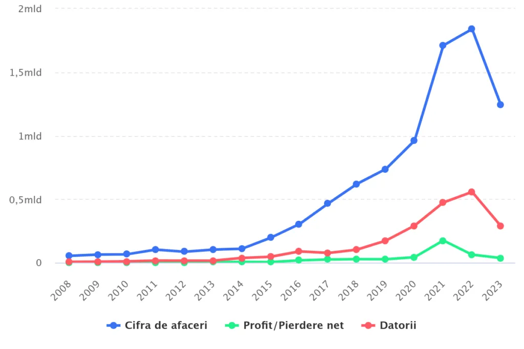 Cifra de afaceri din 2023, de 1,24 miliarde de lei, a fost cu 33% mai mică decât în 2022, când s-a înregistrat 1,83 de milioane de lei. În 2021, cifra de afaceri a fost undeva la 1,7 milioane de lei.