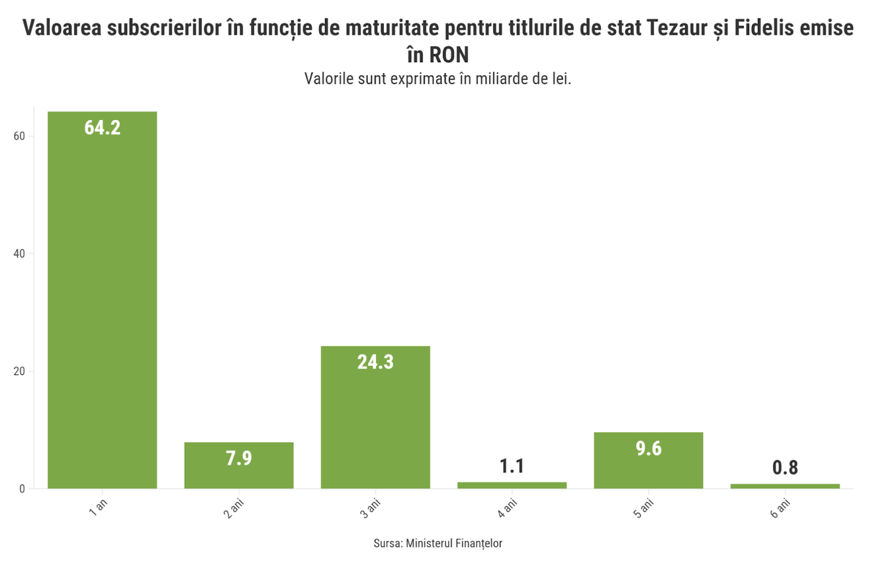 În total, investitorii au plasat 107,9 miliarde de lei în cadrul emisiunilor din cele două programe Tezaur și Fidelis disponibile pentru publicul larg, iar datele arată că 59,5% din suma totală subscrisă în perioada 2018-2025 a fost repartizată pentru maturitatea de un an.