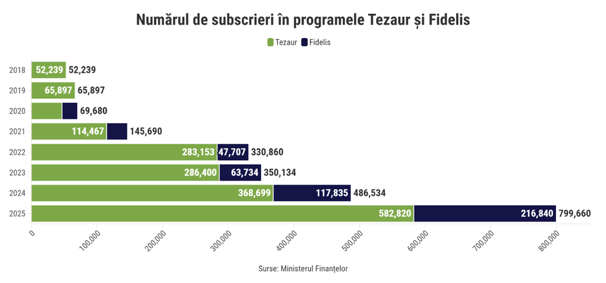 În 2025, cele două programe au avut în total 800.000 de subscrieri, echivalentul a 34,8% din numărul total de subscrieri de la lansarea Tezaur și Fidelis. Ponderea pentru 2025 este foarte apropiată de cea a valorii acestor subscrieri (33% din investițiile totale în cele două programe).
