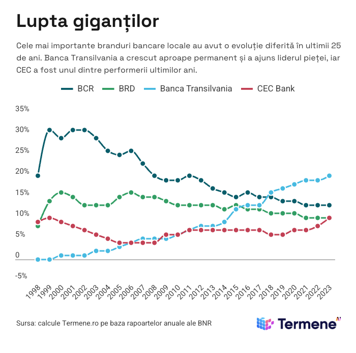 Probabil că nu sunt mulți cei care și-ar fi imaginat în anul 1998 că Banca Transilvania, o mică instituție financiară regională, cu o cotă de piață de mai puțin de 1%, va deveni într-o zi liderul detașat al sistemului bancar românesc. Și totuși, după mai bine de un sfert de secol, această bancă cu capital privat românesc controlează peste 20% din activele bancare ale țării, devansând grupuri bancare europene importante. Această ascensiune spectaculoasă ilustrează perfect transformarea sistemului bancar românesc, un sector care, la fel ca economia țării, a parcurs un drum lung și sinuos, conform unei analize Termene.ro.