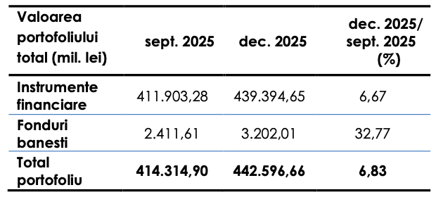 Valoarea portofoliului total a avut o creștere de 6,83%, ajungând la 442,6 mld. lei, comparativ cu trimestrul anterior.