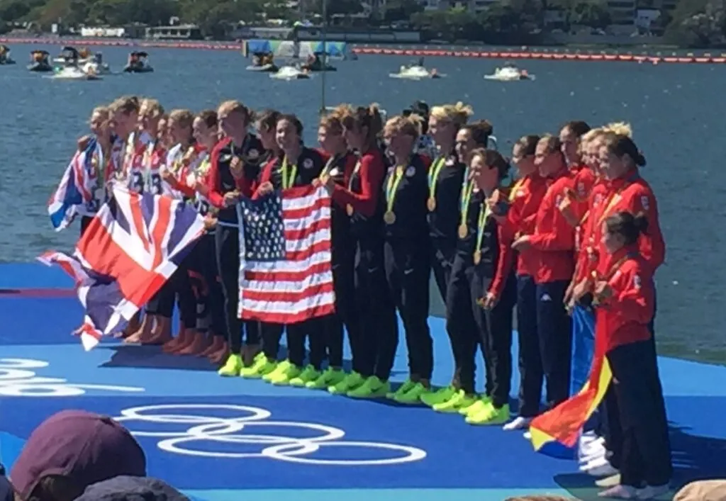 Podiumul cu medaliatele la canotaj (8+1) Romania a obtinul bronzul