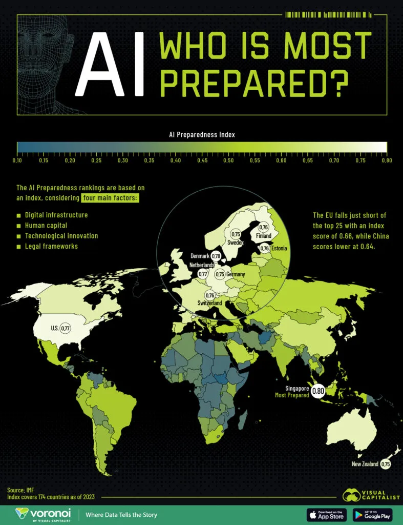 Conform acestui index, primele locuri sunt ocupate de țări precum Singapore, Danemarca și Statele Unite, care au investit masiv în strategii de dezvoltare AI, educație în domeniul digital și infrastructură avansată de date. Aceste țări nu doar că dețin capacități tehnologice puternice, dar și dispun de politici publice care sprijină adoptarea rapidă a AI la nivel național.