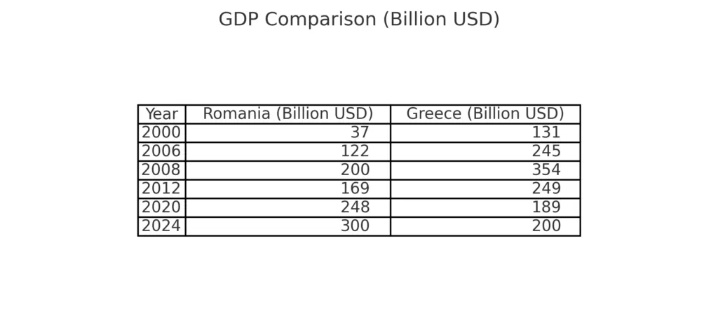 Totuși, după criza financiară, PIB-ul Greciei a scăzut semnificativ, ajungând la 249 miliarde de dolari în 2012, în timp ce România a înregistrat o scădere mai mică, la 169 miliarde USD. Până în 2020, PIB-ul României a atins 248 miliarde de dolari, depășind Grecia (189 miliarde de dolari). În 2024, România este prognozată să ajungă la 300 miliarde de dolari, în timp ce Grecia rămâne în jurul valorii de 200 miliarde de dolari, marcând o schimbare fundamentală în ierarhia economică dintre cele două țări.
