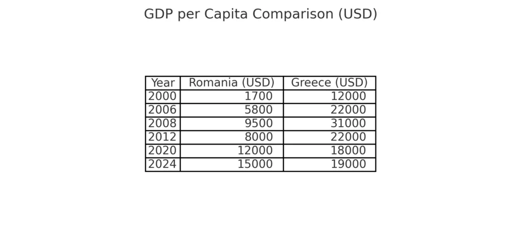 Deși acest decalaj s-a redus în timp, diferența rămânea semnificativă până în 2008 (9.500 de dolari în România față de 31.000 de dolari în Grecia).