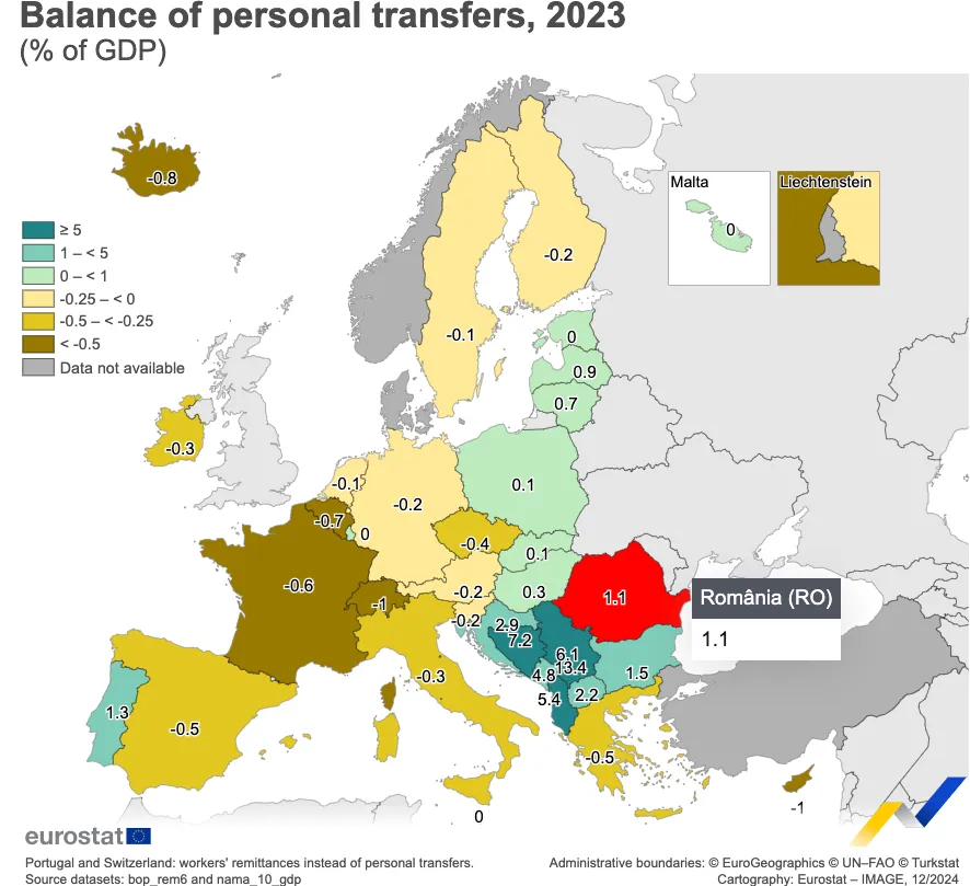 În 2023, transferurile personale au dus la un surplus pentru 9 țări din UE, deoarece intrările lor au depășit ieșirile. Dintre aceste țări, 4 au raportat un surplus care reprezenta mai mult de 1% din produsul intern brut (PIB) respectiv: Croația (2,9% din PIB), Bulgaria (1,5%), Portugalia (1,3%) și România (1,1%).