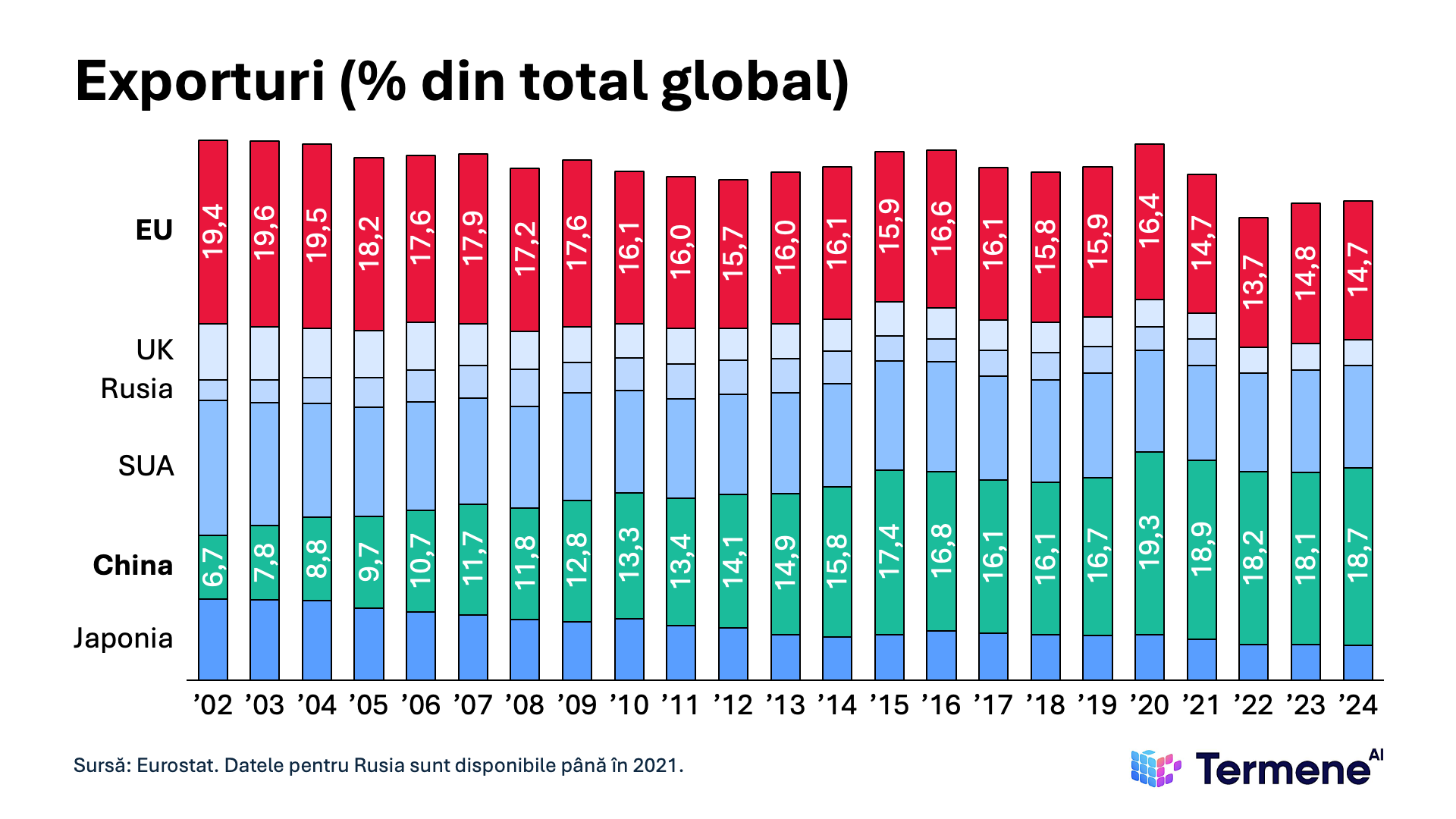 Acea epocă s-a încheiat treptat. Cota UE din exporturile globale a scăzut de la 19,4% în 2002 la 14,7% în 2024, în timp ce China a urcat în același interval de timp de la 6,7% la 18,7%.
