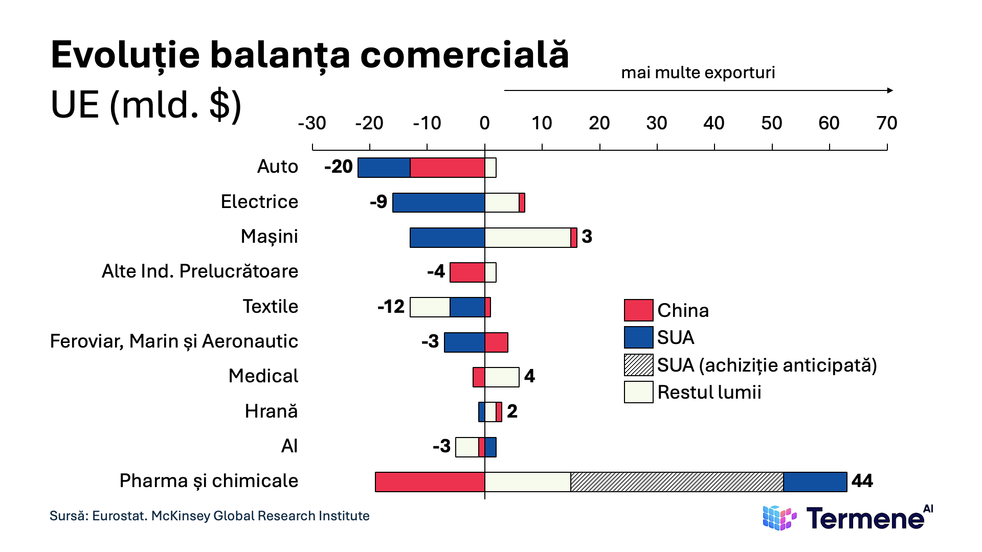 Utilajele industriale și echipamentele energetice au găsit cumpărători în Orientul Mijlociu și Africa. Pharma rămâne excedentară cu 22% (efectul „frontloading”). Acestea sunt sectoarele unde competitivitatea europeană rămâne solidă pe termen mediu.