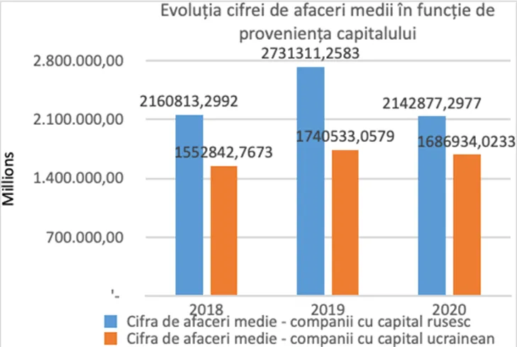 Din punctul de vedere al profitului mediu și al cifrei de afaceri medii, în toți cei 3 ani de analiză, companiile cu capital rusesc s-au dovedit mai performante. În anul 2018, o companie cu capital rusesc obținea, în medie, o cifră de afaceri de 2,16 milioane lei, pe când una cu capital ucrainean înregistra venituri de doar 1,55 milioane lei (cu aproximativ 0,5 milioane lei mai puțin). Decalajul s-a dublat în anul 2019, când o companie cu capital rusesc obținea, în medie, o cifră de afaceri de 2,73 milioane lei, iar una cu capital ucrainean, cu aproximativ 1 milion lei mai puțin – mai exact 1,74 milioane lei. În anul 2020, decalajul a revenit la valoarea anului 2018, (aproximativ 0,55 milioane lei), o companie cu capital rusesc obținând, în medie, o cifră de afaceri de 2,14 milioane lei, pe când una cu capital ucrainean a obținut 1,69 milioane lei.