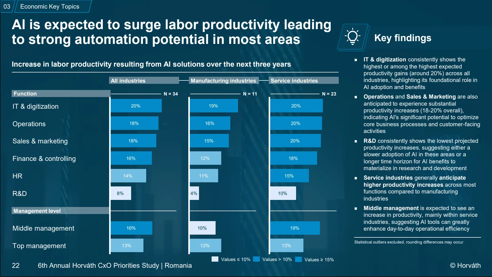 Mai exact, executivii care au participat la studiu așteaptă, în medie, creșteri de productivitate de 20% în departamentele de IT și digitalizare, 18% în operațiuni, vânzări și marketing, 16% în financiar și 14% în HR.