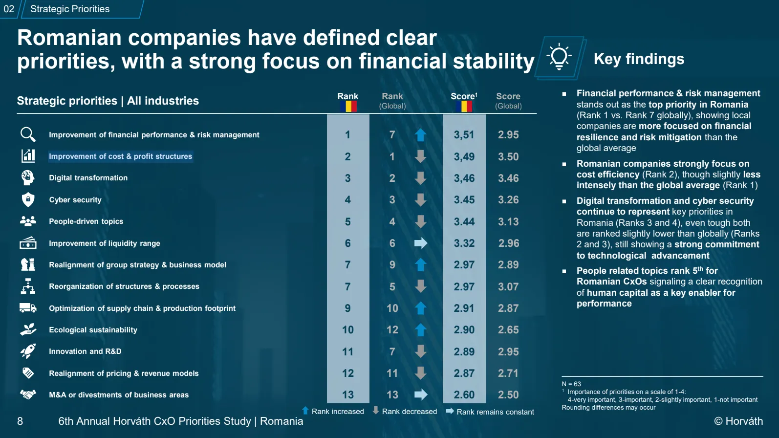 Îmbunătățirea performanței financiare și managementul riscului reprezintă prioritatea principală a executivilor din România în 2025, conform studiului Horváth, în timp ce la nivel global această temă se plasează abia pe locul șapte în topul priorităților.