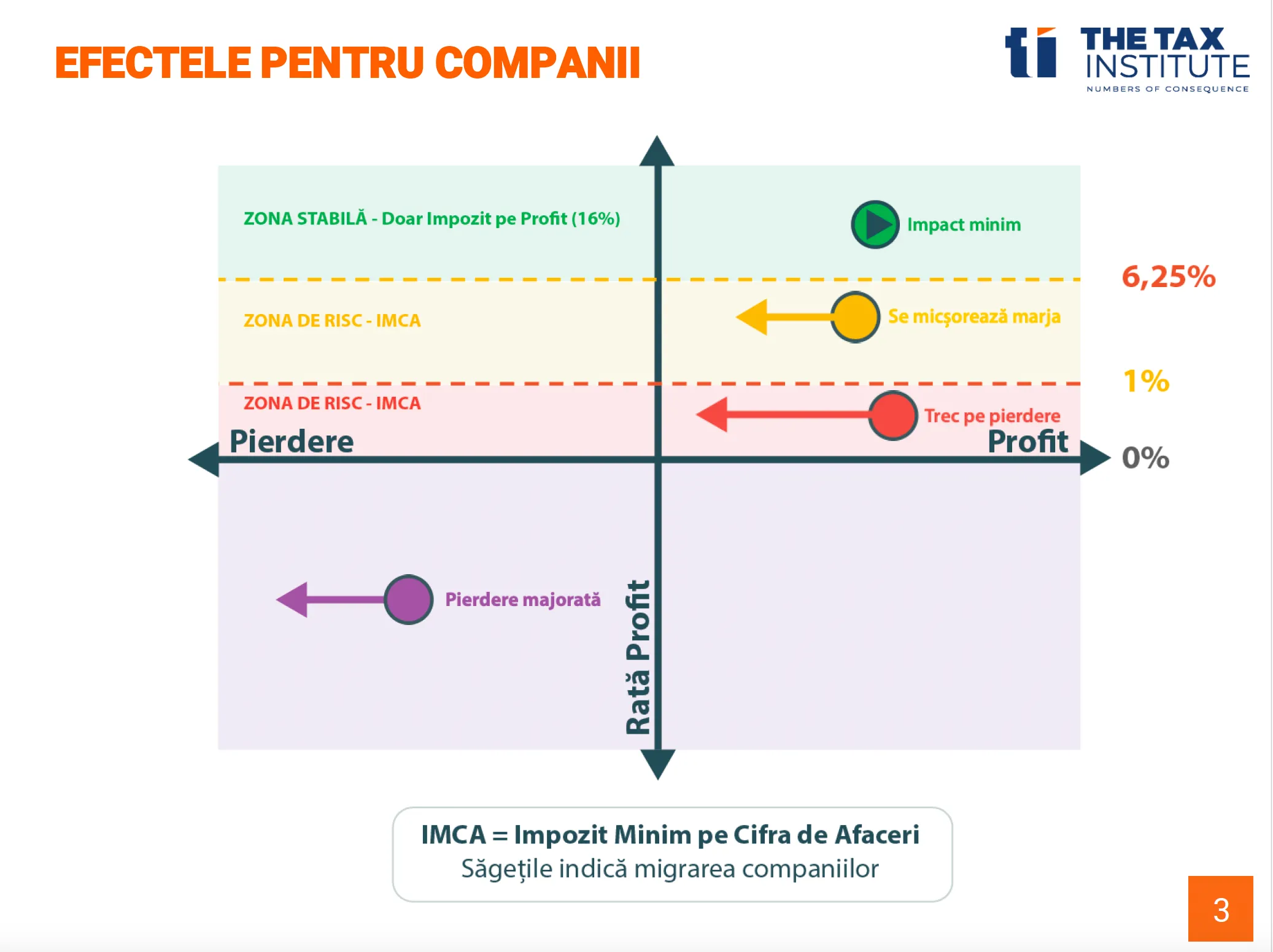 Acestora li se micșorează marja, iar rata efectivă de impozit pe profit, recalculată după aplicarea IMCA, este cuprinsă, așa cum era menționat și în studiul TAX Institute, între 16% pentru companiile cu rata profitului de 6,25% și chiar 100% pentru companiile care aveau o rata profitului brut de de doar 1%.