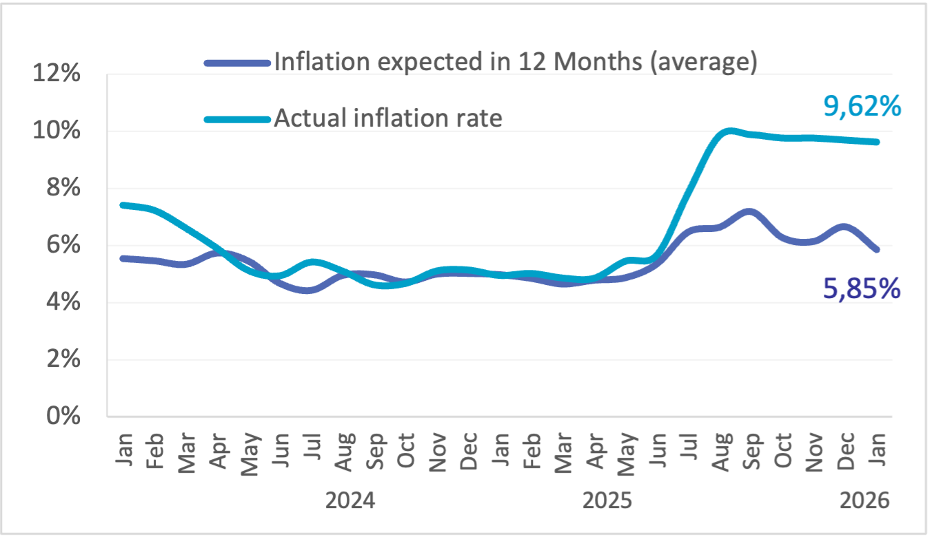 Rata anticipată a inflației pentru orizontul de 12 luni (februarie 2027) a scăzut comparativ cu valoarea înregistrată în luna precedentă și a atins nivelul de 5,85%, iar 94% dintre participanți anticipează reducerea ratei inflației în următoarele 12 luni comparativ cu valoarea prezentă a acesteia.