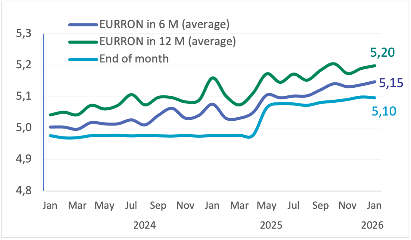 În ceea ce privește cursul de schimb EUR/RON, aproximativ 83% dintre participanți anticipează o depreciere a leului în următoarele 12 luni. Astfel, valoarea medie a anticipațiilor pentru orizontul de 6 luni este de 5,1471 lei pentru un euro, în timp ce pentru orizontul de 12 luni, valoarea medie a cursului EUR/RON anticipat este de 5,1982 lei pentru un euro.