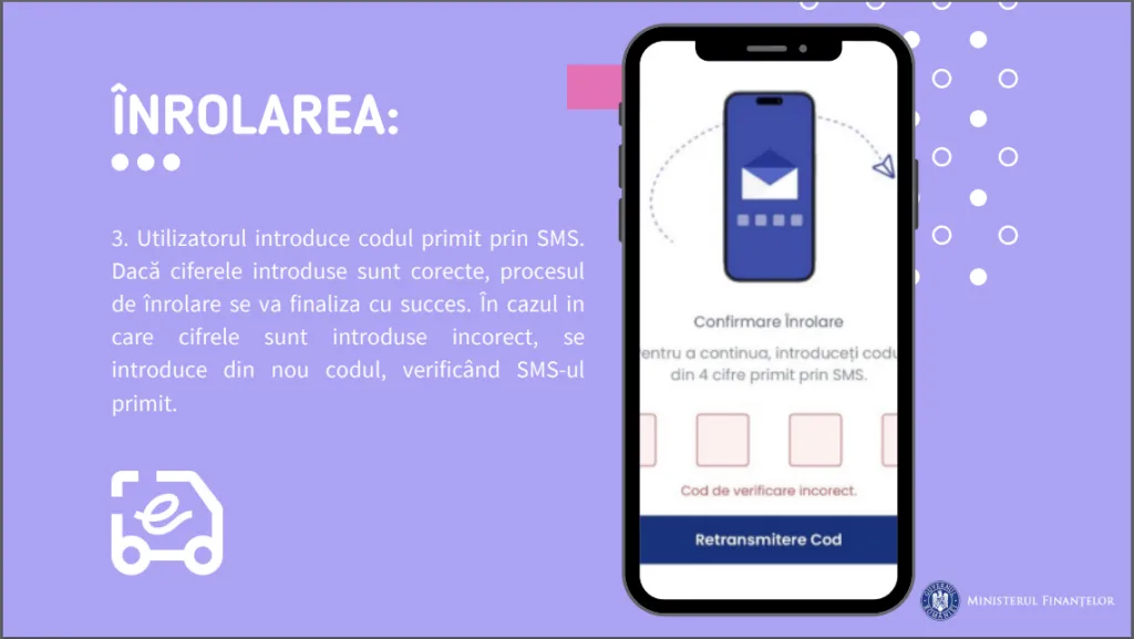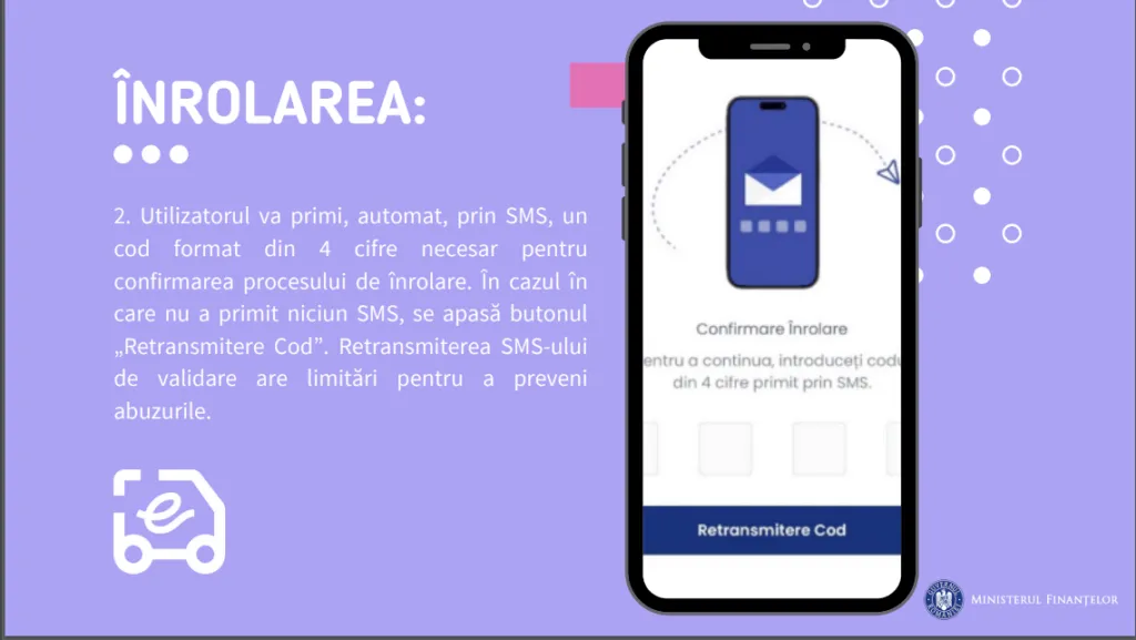 - 2. Utilizatorul va primi, automat, prin SMS, un cod format din 4 cifre necesar pentru confirmarea procesului de înrolare. În cazul în care nu a primit niciun SMS, se apasă butonul „Retransmitere Cod”. Retransmiterea SMS-ului de validare are limitări pentru a preveni abuzurile.