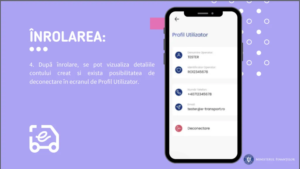 - 4. După înrolare, se pot vizualiza detaliile contului creat si exista posibilitatea de deconectare în ecranul de Profil Utilizator.