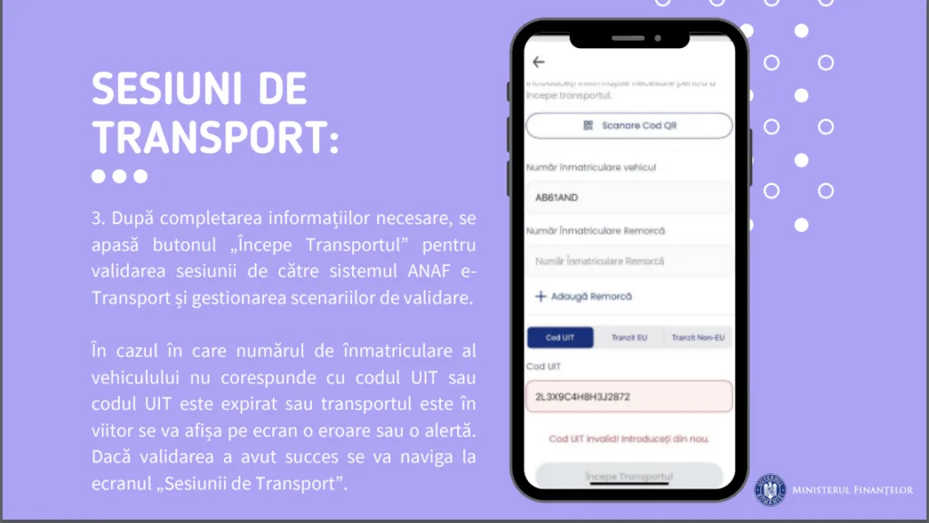 În cazul în care numărul de înmatriculare al vehiculului nu corespunde cu codul UIT sau codul UIT este expirat sau transportul este în viitor se va afișa pe ecran o eroare sau o alertă. Dacă validarea a avut succes se va naviga la ecranul „Sesiunii de Transport”.