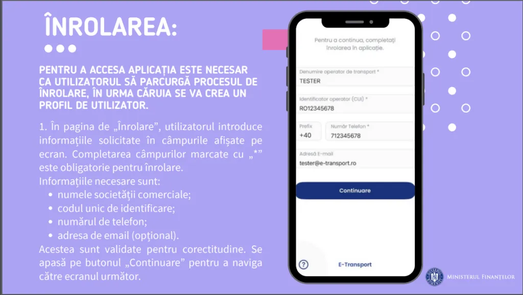 Pentru a se utiliza sistemul e-Transport este nevoie mai întâi de înregistrarea în aplicație.