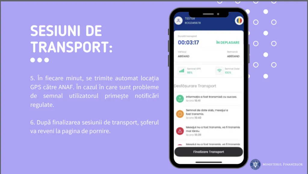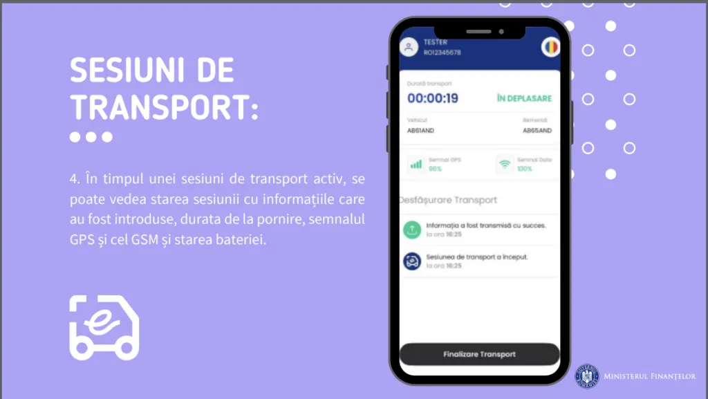 - Pentru a începe un transport, se finalizează procesul de înregistrare sesiune, completând informațiile necesare pentru a începe transportul, simplu și rapid. În timpul unei sesiuni de transport activ, se pot vedea: starea sesiunii cu informațiile care au fost introduse, durata de la pornire, semnalul GPS și cel GSM și starea bateriei. În fiecare minut, locația GPS se trimite automat către ANAF.