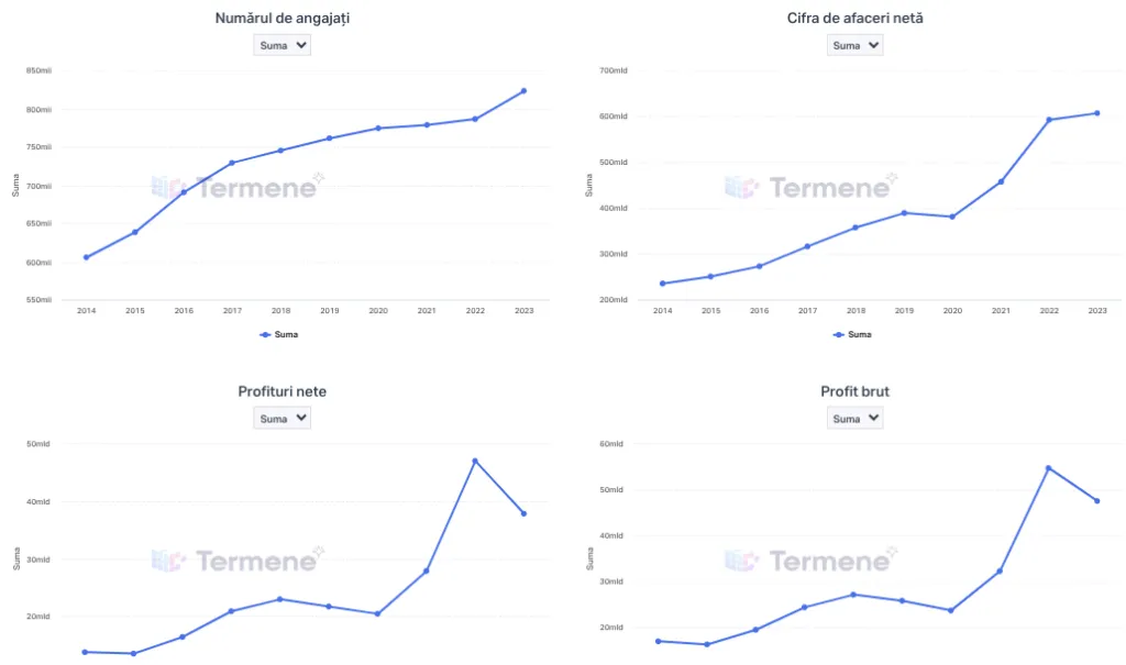 Conform datelor platformei Termene.ro, obținute cu ajutorul soluției Termene Pasp, 304 de agenți economici alcătuiesc lista marilor companii care înregistrează minimum 1.000 de angajați pe anul 2023. Datele financiare pentru anul 2024 vor fi publicate de Ministerul Finanțelor începând cu luna aprilie 2025.