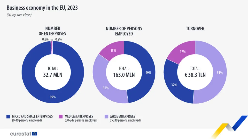 Marea majoritate, 99% (32,4 milioane de întreprinderi), au fost întreprinderi micro și mici, cu până la 49 de angajați. Împreună, întreprinderile micro și mici au angajat aproape jumătate din toate persoanele ocupate în economia de afaceri (49%, 80,1 milioane). Ele au generat 12,2 trilioane de euro în cifra de afaceri netă, reprezentând 32% din totalul cifrei de afaceri nete. Aceste informații provin din datele preliminare privind statisticile structurale de afaceri (SBS) pentru 2023, publicate de Eurostat.