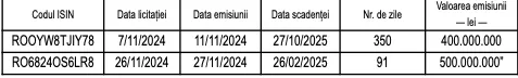 „În vederea finanțării deficitului bugetului de stat, refinanțării și rambursării anticipate a datoriei publice în luna noiembrie 2024, Ministerul Finanțelor anunță lansarea a două emisiuni de certificate de trezorerie cu discont, astfel”: