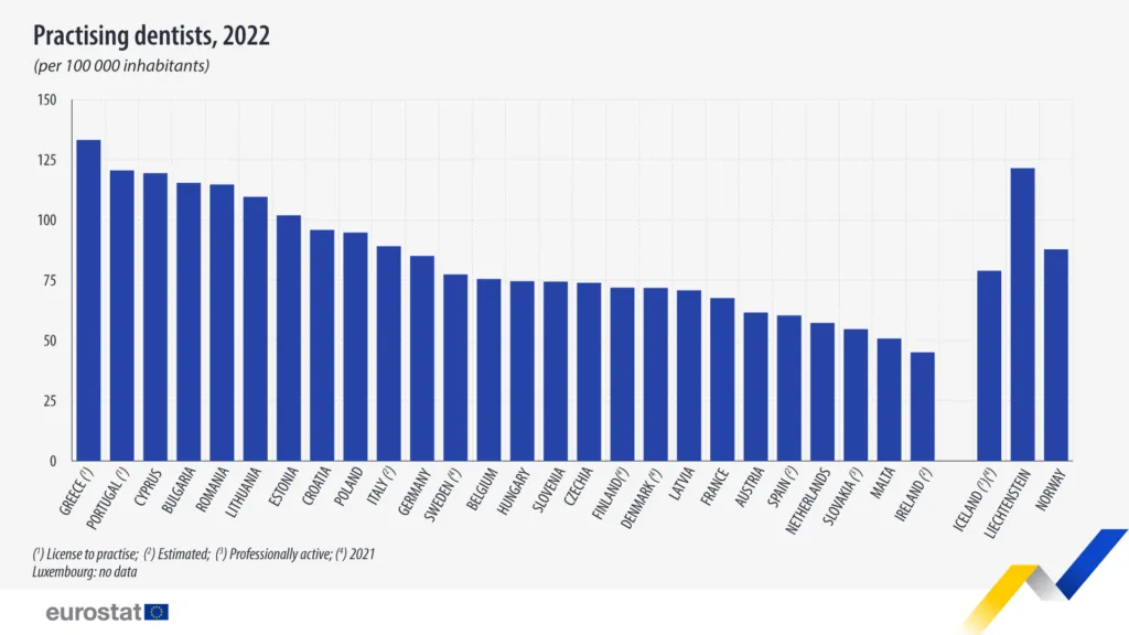 Dintre cele 26 de țări pentru care sunt disponibile date, în 2022 erau 363.162 de dentiști. Țara cu cel mai mare procent de dentiști practicanți raportat la populație a fost Cipru (cu 119,4 dentiști la 100.000 de locuitori), în timp ce Grecia (cu 133,2 dentiști la 100.000 de locuitori) și Portugalia (120,6 dentiști la 100.000 de locuitori) au raportat procente mai mari de dentiști licențiați pentru a practica, conform unei analize a Eurostat, biroul de statistică a Comisiei Europene.