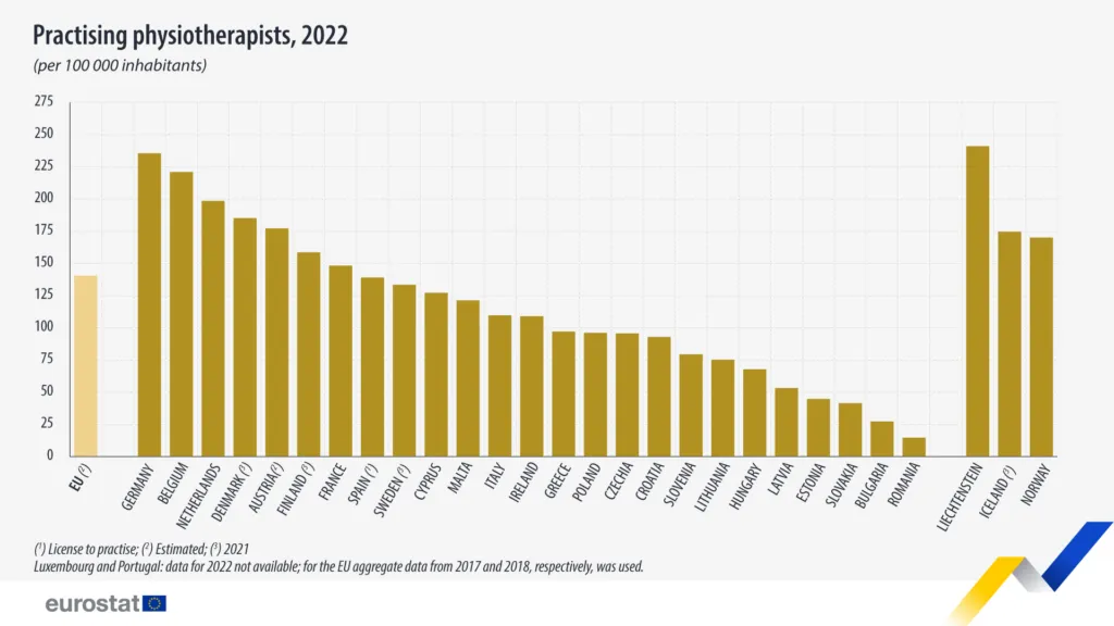 Germania conducea în UE cu 235,1 fizioterapeuți la 100.000 de locuitori, urmată de Belgia (220,5) și Țările de Jos (198,1).