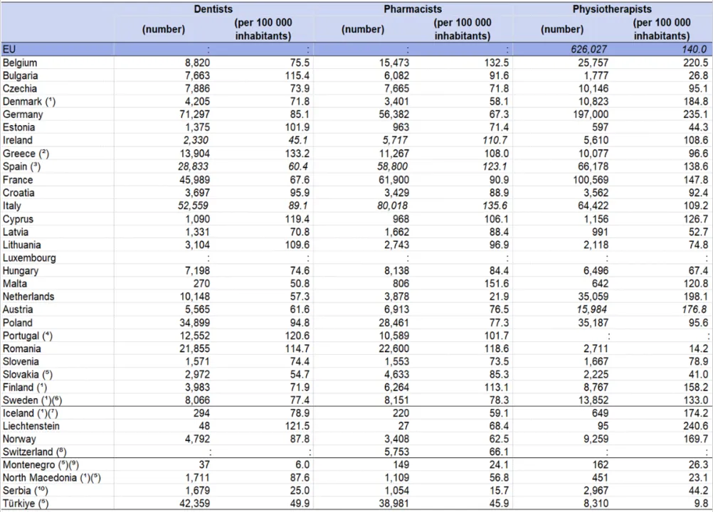 În 2022, în Uniunea Europeană erau peste 1,4 milioane de profesioniști din domeniul sănătății care lucrau ca dentiști, fizioterapeuți sau farmaciști, conform unei analize a Eurostat, biroul de statistică a Comisiei Europene. România se află pe poziția a cincea în ceea ce privește numărul de stomatologi la 100.000 de locuitori.