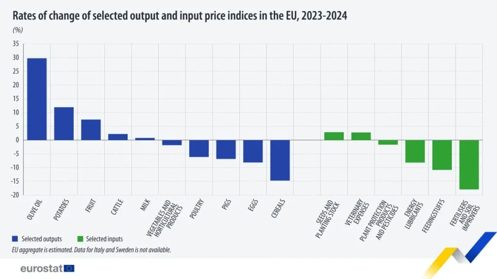 Estimările preliminare pentru 2024 indică faptul că prețul mediu al produselor agricole (output) în UE a scăzut cu 2% comparativ cu 2023, în timp ce prețul mediu al bunurilor și serviciilor consumate în agricultură (inputuri) a scăzut cu 6%.