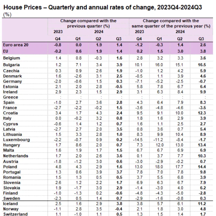 Dintre țările pentru care există date, 4 au înregistrat scăderi anuale ale prețurilor locuințelor în T3 2024, iar 22 au înregistrat creșteri anuale. Cele mai mari scăderi au fost înregistrate în Franța (-3,5%), Finlanda (-2,8%) și Luxemburg (-1,7%), în timp ce cele mai mari creșteri au fost în Bulgaria (+16,5%), Polonia (+14,4%), Ungaria (+13,4%), Croația (+12,3%) și Olanda (+10,3%).