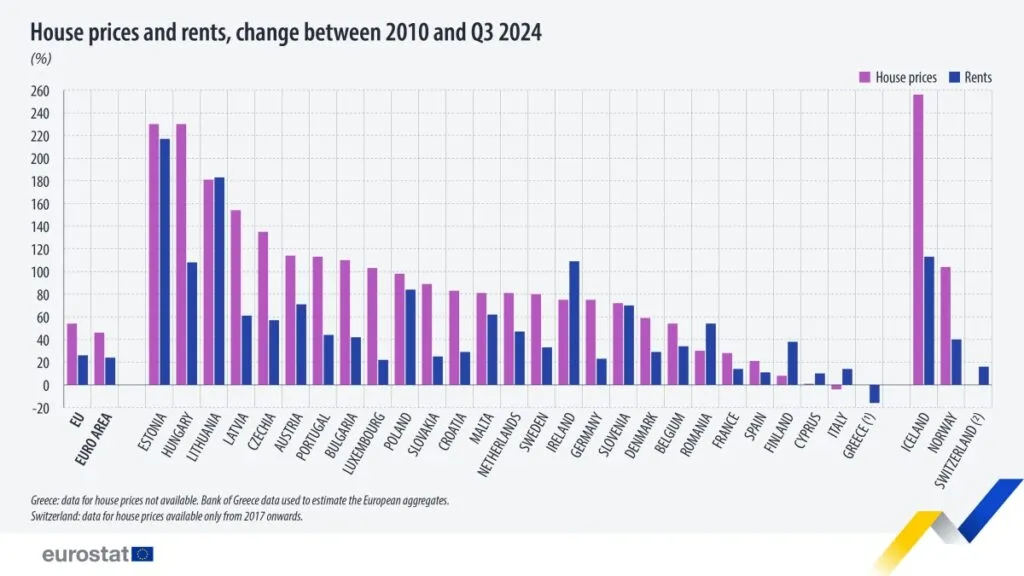 În aceeași perioadă, chiriile au crescut în 26 de țări UE, cele mai mari creșteri fiind înregistrate în Estonia (+216%), Lituania (+183%), Irlanda (+109%) și Ungaria (+108%). Grecia a fost singura țară în care prețurile chiriilor au scăzut (-16%).