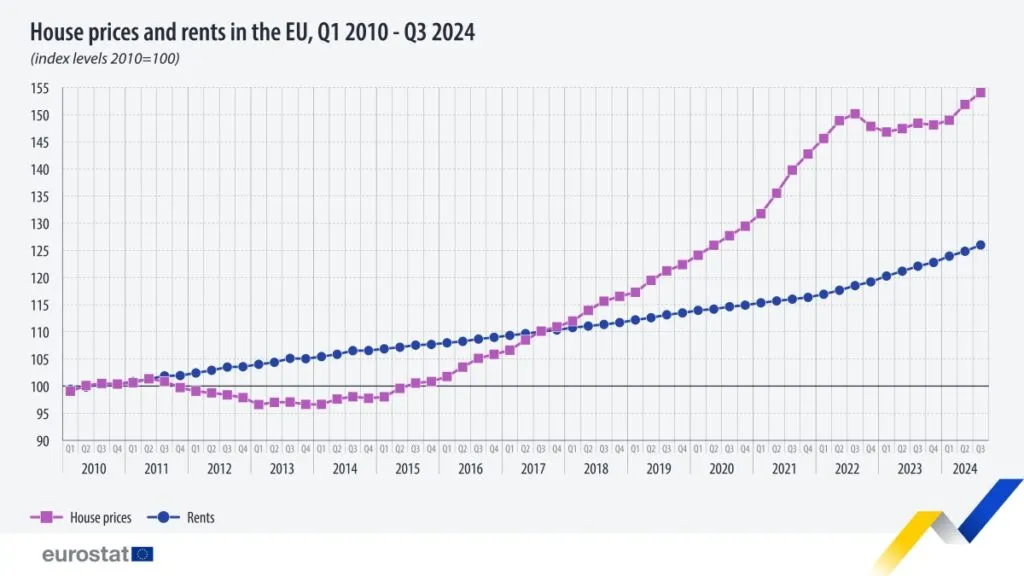 Din 2010 și până în 2024 chiriile locuințelor au crescut într-un ritm mai alert în România față de prețul de vânzare. Dacă o chirie a crescut cu 55%, costul de cumpărare a unei locuințe s-a indexat cu 30%, conform unei analize a Eurostat, biroul de statistică a Comisiei Europene. Raportat la ultimul an, prețurile de vânzare de la sfârșitul lui 2024 au crescut ușor.
