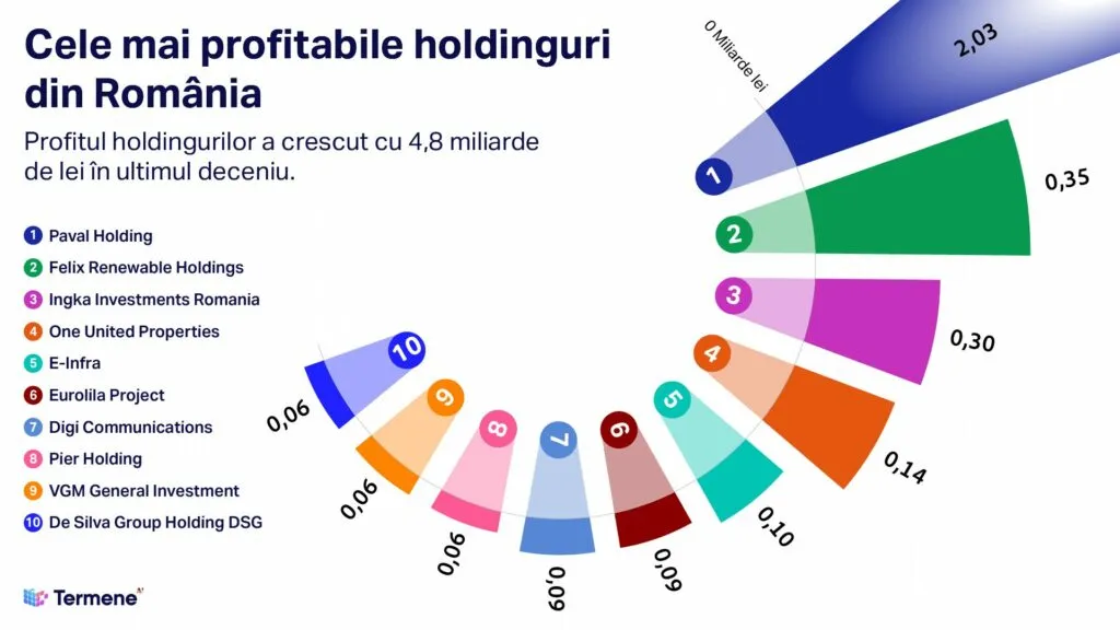 Profitul net al societăților din domeniu a fost de 4,87 miliarde de lei anul trecut. În 2022, profitul a fost de 4,53 miliarde de lei. În urmă cu un deceniu, profitul holdingurilor era de 89 milioane de lei. Astfel, profitul mediu al unui holding care a depus bilanțul este de aproximativ 4,81 milioane de lei.