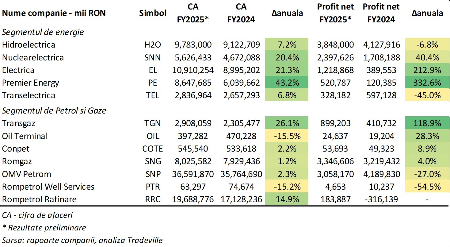 De menționat că aici avem rezultatele financiare preliminare, deci nu sunt finale. Vedem creșteri pe cifră de afaceri la majoritatea companiilor și datorită liberalizării pieței energetice, dar în schimb vedem la profitabilitate câteva scăderi, cum ar fi Hidroelectrica. Aici, după cum știm, nivelul de precipitație e mai redus, a dus la o scădere a profitului. Analiștii se așteptau să fie chiar și mai ridicată, însă vedem 3,8 miliarde de lei profit.