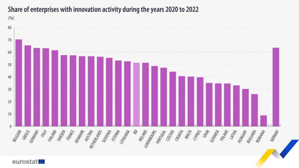 51% din totalul întreprinderilor din UE au raportat că au avut o anumită formă de activitate de inovare în perioada 2020-2022, potrivit Anchetei Comunitare privind Inovarea (CIS). CIS raportează cu privire la inovarea în materie de produse și procese în întreprinderile din UE.