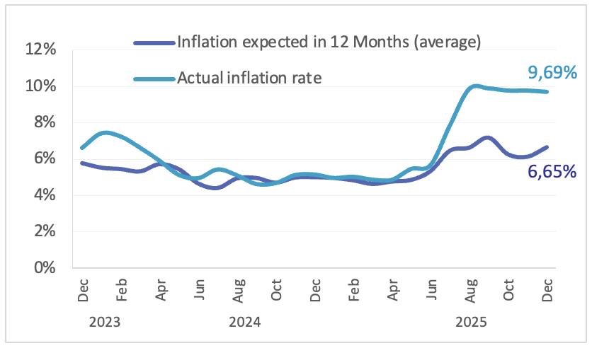 Rata anticipată a inflației pentru orizontul de 12 luni (ianuarie 2027) a crescut comparativ cu valoarea înregistrată în luna precedentă și a atins nivelul de 6,65%, iar 68% dintre participanți anticipează reducerea ratei inflației în următoarele 12 luni comparativ cu valoarea prezentă a acesteia.