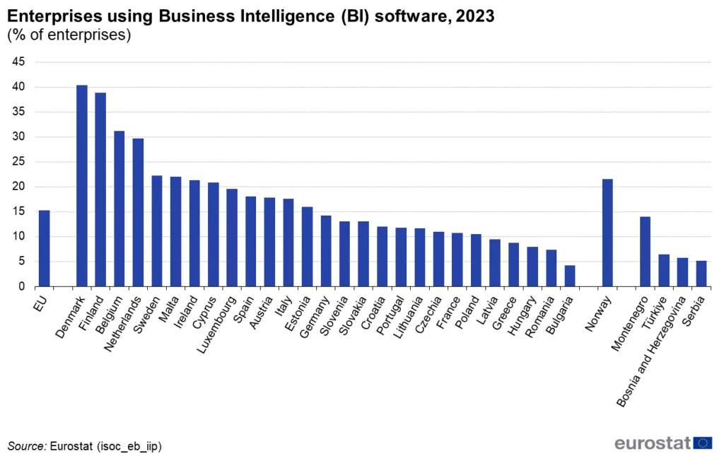 Software-ul de business intelligence (BI) accesează și analizează datele din sistemele IT interne și din surse externe și prezintă constatări analitice în rapoarte, rezumate, tablouri de bord, grafice, diagrame și hărți, pentru a oferi utilizatorilor informații detaliate pentru luarea deciziilor și planificarea strategică. În 2023, 15,3 % dintre întreprinderi au raportat că utilizează software BI, un procent mai mic în comparație cu ERP și CRM. Acest lucru nu a fost însă cazul întreprinderilor mari, unde ponderea întreprinderilor care utilizează software BI (62,6 %) a fost mai mare decât ponderea întreprinderilor care utilizează CRM (60,5 %).