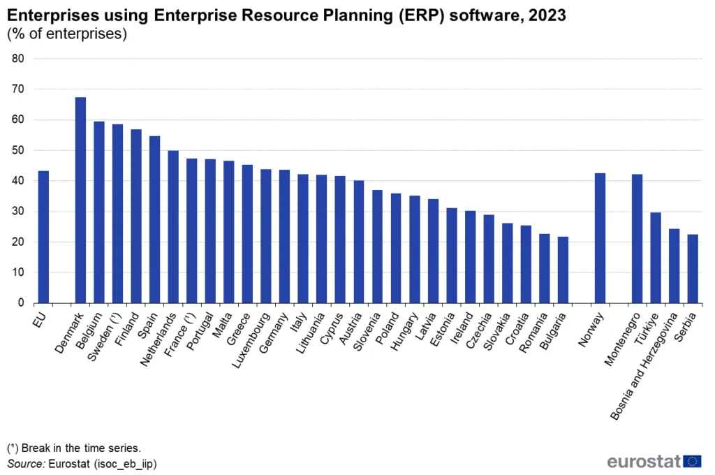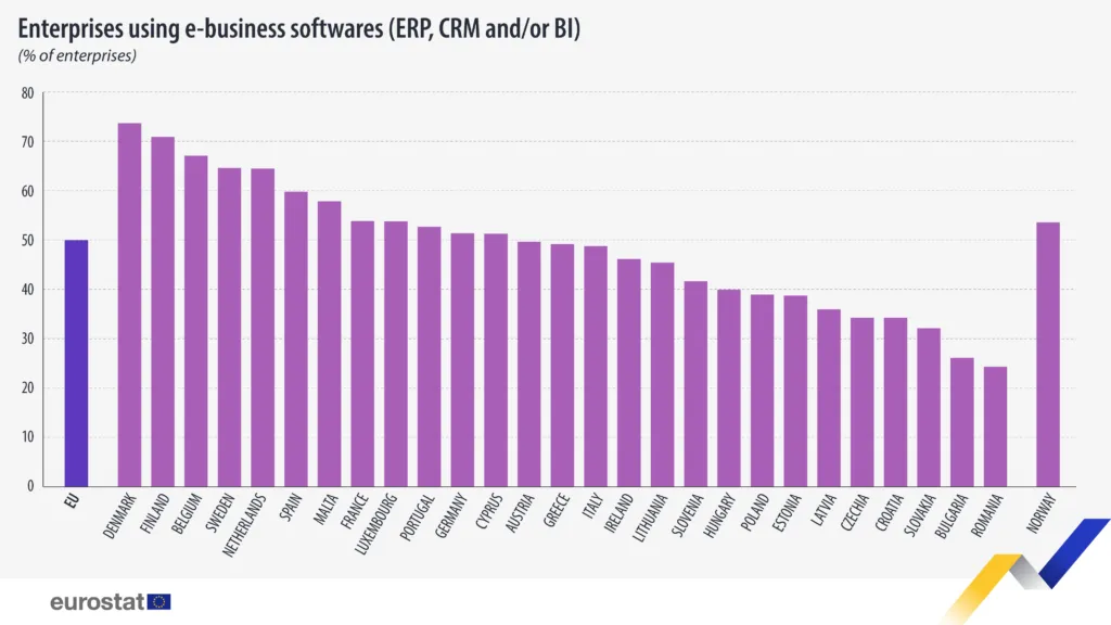 În 2023, mai mult de jumătate dintre întreprinderile din Danemarca (67,3%), Belgia (59,5%), Suedia (58,6%), Finlanda (56,9%) și Spania (54,6%) au folosit software ERP pentru a partaja informații între diferite zone funcționale. Pe de altă parte, software-ul ERP a fost folosit de 22,6% dintre întreprinderile din România și 21,7% din Bulgaria.
