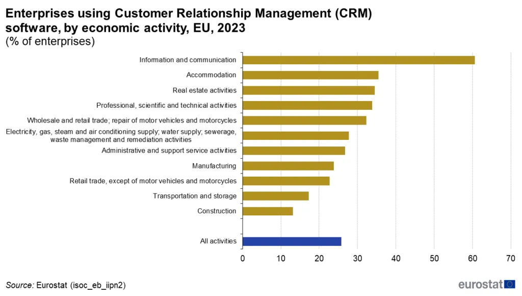În ceea ce privește activitatea întreprinderilor, în 2023, nivelurile de adoptare a CRM au fost cele mai ridicate în informare și comunicare, cu 60,6 % dintre întreprinderi. Cele mai mici ponderi ale întreprinderilor care utilizează CRM s-au înregistrat în sectorul transport și depozitare (17,3 %) și în sectorul construcțiilor (13,1 %).