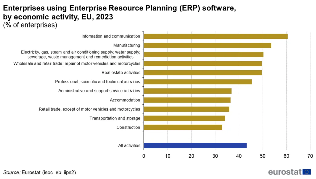O comparație între diferitele sectoare economice arată că, în 2023, mai mult de jumătate dintre întreprinderile din sectorul informației și comunicațiilor (60,5%), din producție (53,6%) și din energie electrică, gaze, abur și aer condiționat (50,3%) au folosit ERP. Ponderi ale întreprinderilor care utilizează ERP mai mari de 40% au fost înregistrate și în activități profesionale, științifice și tehnice (45,4%), în comerțul cu ridicata și cu amănuntul (49,7%) și în activități imobiliare (49,7%). Cele mai scăzute rate de adoptare a software-ului ERP au fost înregistrate în construcții (33%)
