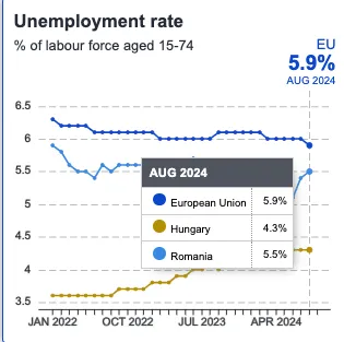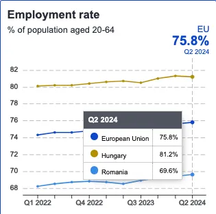 În ceea ce privește piața muncii, Ungaria a câștigat aproape toate comparațiile cu România, de la rata șomajului la rata de angajare. Inclusiv procentul tinerilor care nu muncesc și nici nu urmează studii este de două ori mai mic decât în România.