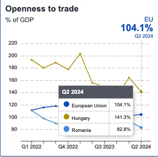 Ungaria mai domină România și din punct de vedere comercial. Statul vecin importă mai puțin decât România și exportă mai mult.