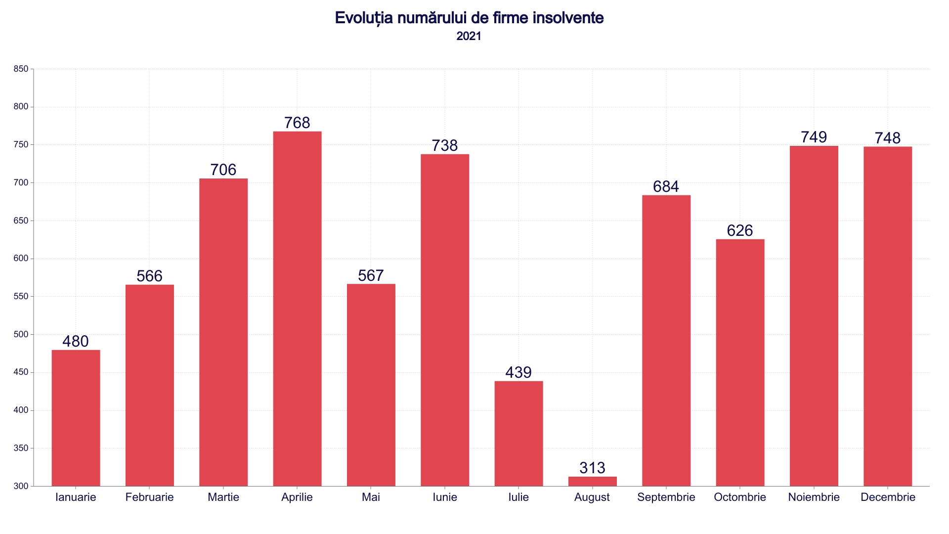 7.384 de societăți au intrat în insolvență în 2021 – cele mai multe în aprilie (768 de firme), urmată de noiembrie (749) și nu la mare diferență, decembrie, cu 748 de firme. În luna august doar 313 societăți au intrat în insolvență.