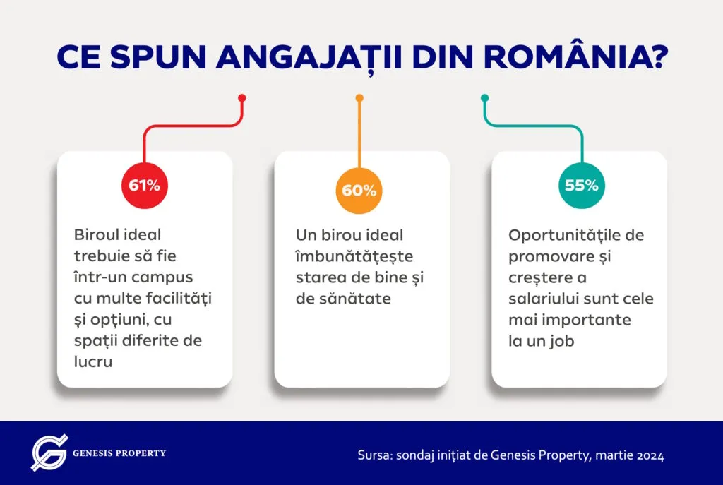 Potrivit unui sondaj realizat de Genesis Property, din cei 1.247 de respondenți reprezentând mai multe generații la nivel național, aproape 61% dintre angajați consideră că biroul ideal trebuie să fie într-un campus cu multe facilități și opțiuni pentru viața la birou și timpul liber, cu spații diferite unde pot lucra în funcție de nevoile lor.